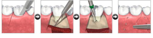 歯周病によって溶けてなくなってしまった骨など歯を支えている組織を回復させる治療法です。失われた組織を回復させるためのスペースを作り、その中に歯周組織再生を誘導する薬剤(エムドゲインまたはリグロス)を入れ再生を図ります。